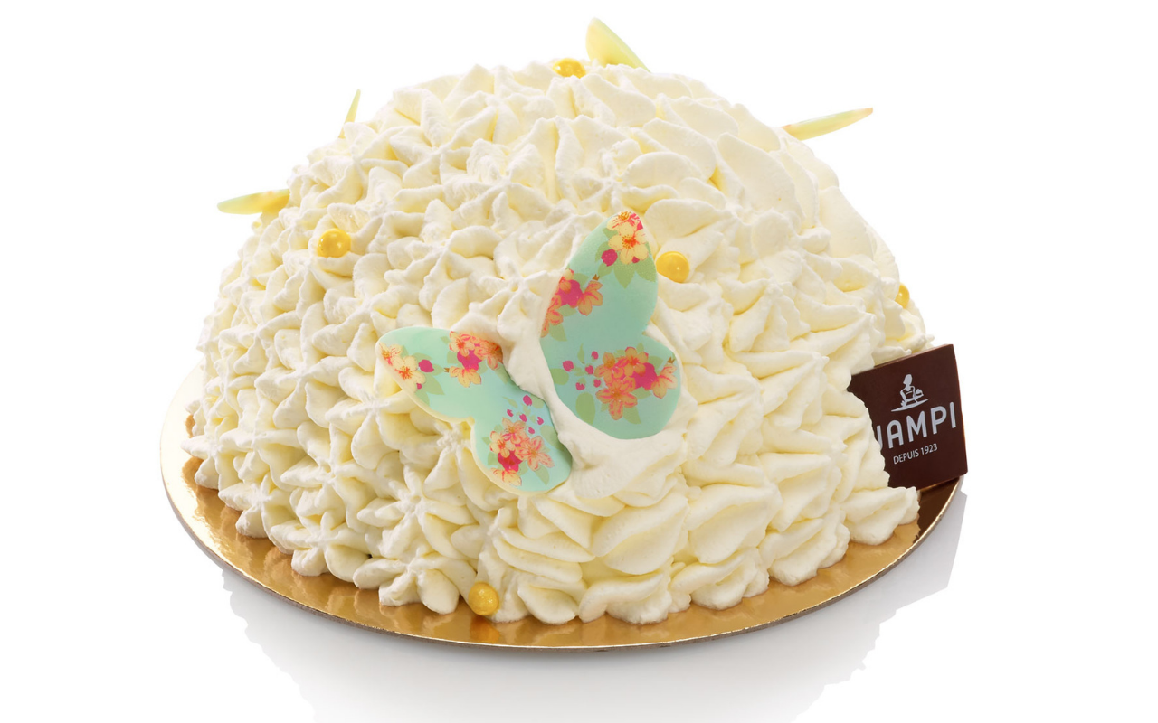 Crème fraîche 19%, purée de fraise 19% (fraise 85%, sirop de sucre inverti 15%), purée de framboise 16% (framboise 85%, sirop de sucre inverti 15%), eau purifiée par osmose, sucre blanc de canne, lait de Bretagne, papillons en chocolat (beurre de cacao, sucre, saccharose, colorants, fleurs naturelles, gomme d’acacia, arôme naturel, sirop de glucose), sucre semoule, sirop de glucose, sucre glace, poudre d’amande, chocolat (cacao, sucre, beurre de cacao, émulsifiant : lécithine de tournesol), blancs d’œufs, poudre de lait entier, dextrose, jaunes d’œufs, stabilisants (pectine, saccharose, farine de graines de caroube, gomme guar), protéines de pois hydrolysées, extrait de vanille 0,07%, arôme d’amande amère 0,02%, chocolat blanc (sucre, beurre et pâte de cacao, lait entier en poudre, cacao maigre en poudre, arôme naturel de vanille, colorants : E162, E120, amidon de maïs, extrait de spiruline), carré de chocolat (chocolat noir, sucre, émulsifiant : lécithine de tournesol, colorant : E172).