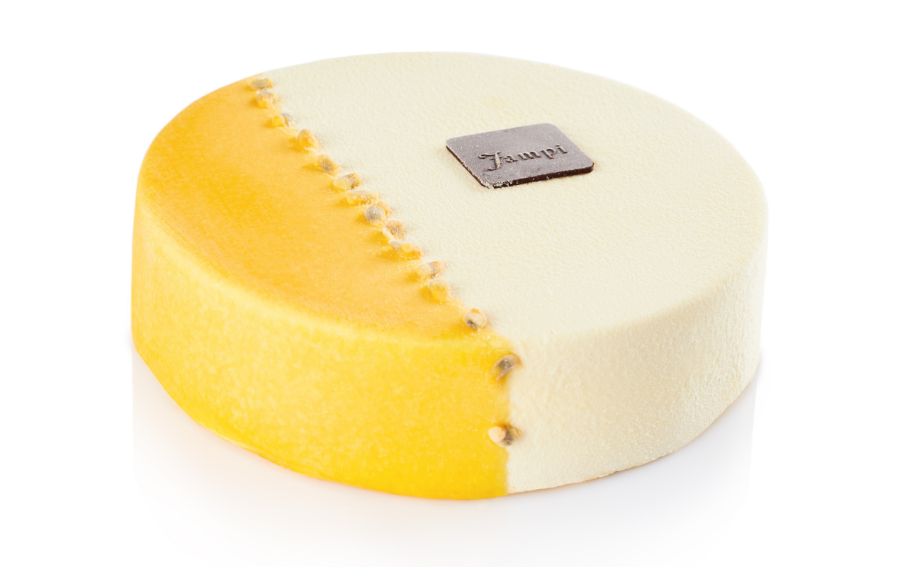 Crème glacée vanille bourbon 50%, sorbet passion 25%, biscuit joconde – passion 10%, coeur coulant 9%, glaçage mangue 3%, chocolat blanc 2%, grains de passion 0,6%, carré de chocolat 0,4%